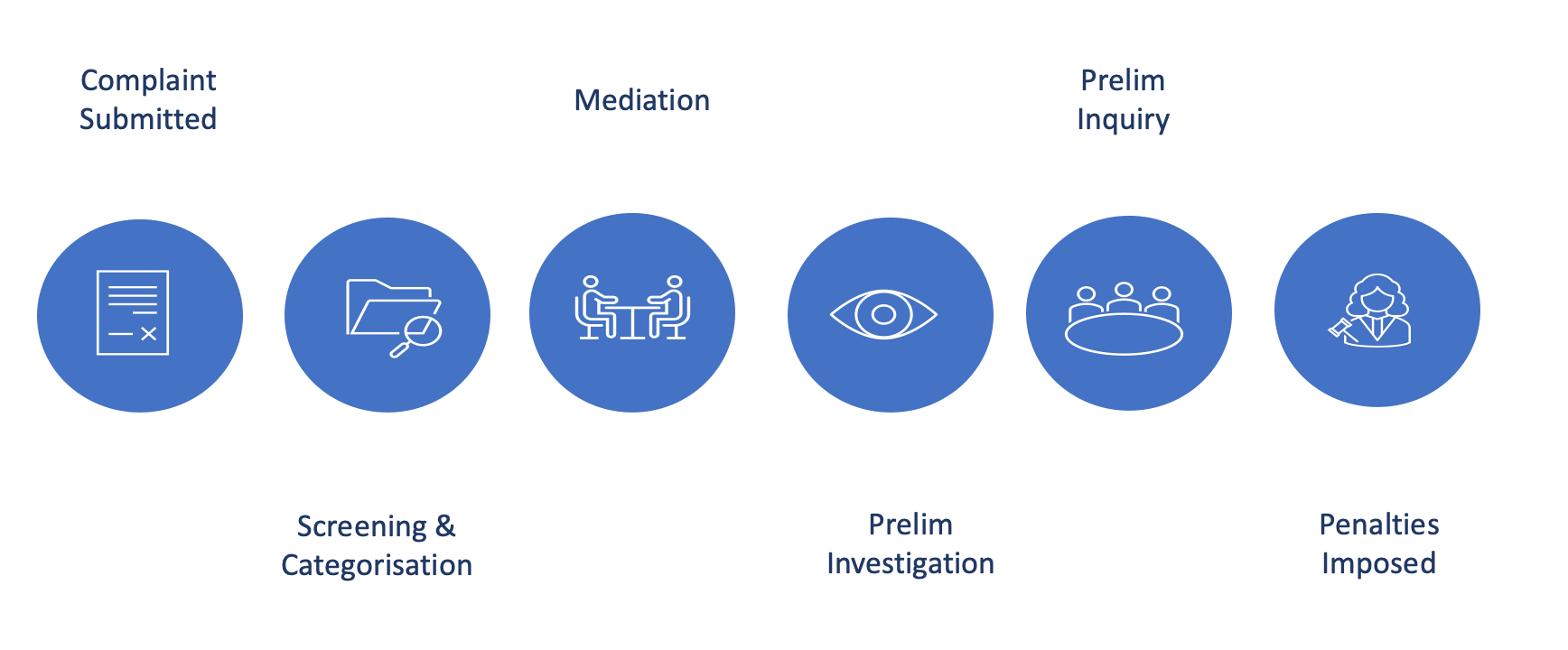 After screening, a process of perusal, analysis and categorisation takes place. Then a complaint is registered against the name of the practitioner and referred for either mediation or preliminary investigation depending on the transgression.